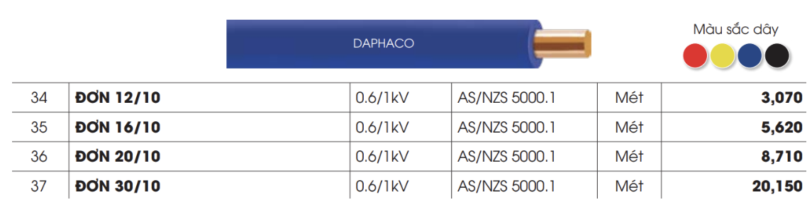 Daphaco ĐƠN 30/10 : Dây đơn cứng 0,6/1 kVLoại dây điện ruột đồng 1 sợi ( cấp 1 )Nhiệt độ cho phép của ruột dẫn lúc vận hành lên đến 70ºC Lắp đặt trong điều kiện được bảo vệ, tránh tác động từ môi trườngPhù hợp cho các công trình dân dụngSản xuất theo hệ thống quản lý chất lượng ISO 9001-2015Tiêu chuẩn áp dụng AS/NZS 5000.1 Thương hiệu Daphaco ( Việt Nam )