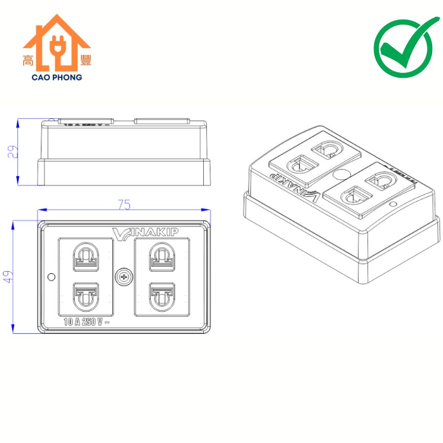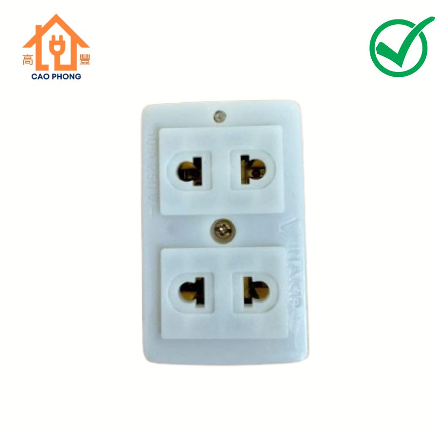 - Quy cách: Hộp gồm 10 cái ổ cắm 2 lỗ 2 chấu Vinakip.