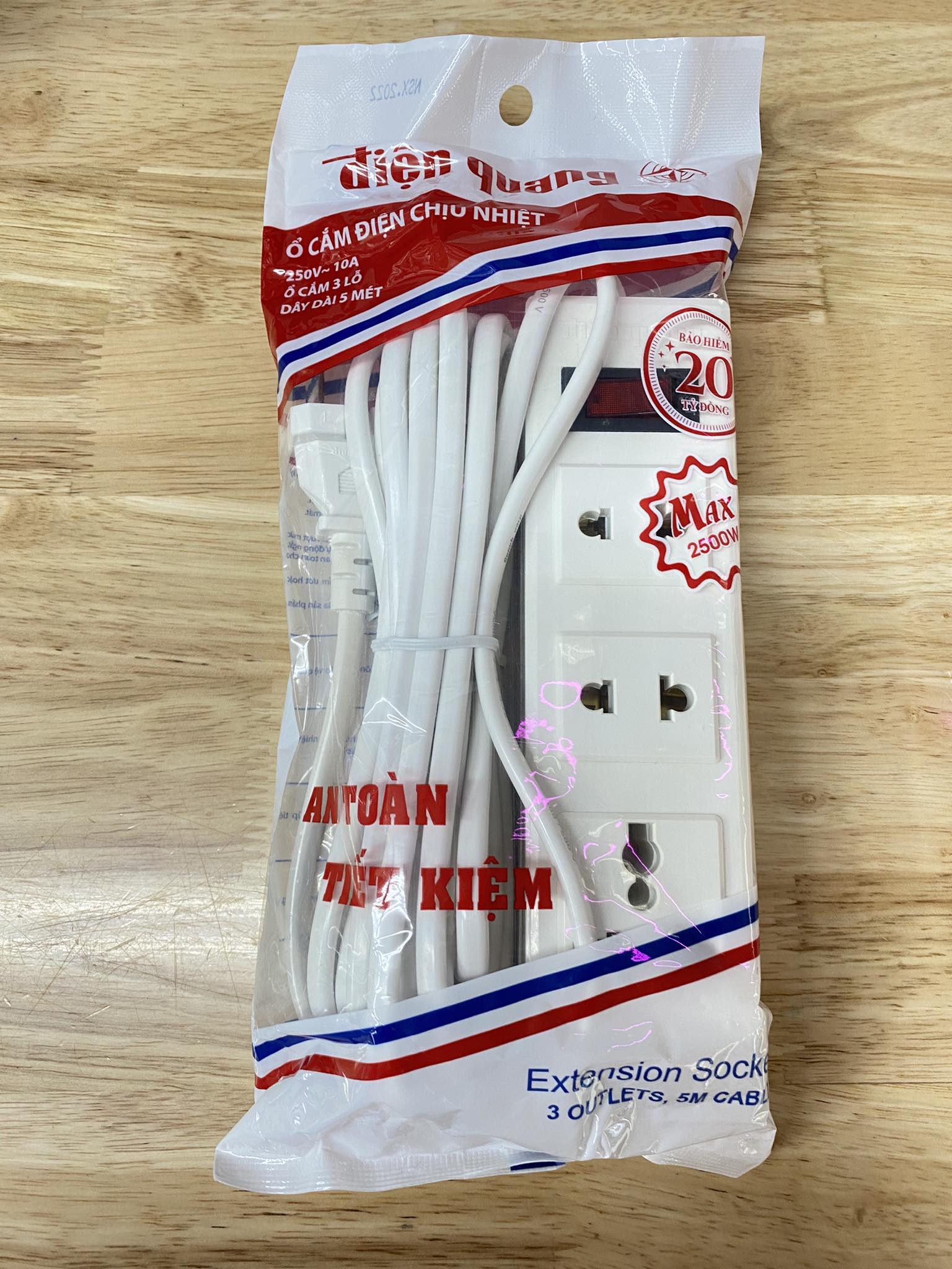 Ổ CẮM NỐI LƯU ĐỘNG 5M Xuất xứ: Việt Nam.Ổ cắm có 2 mặt : 1 mặt 2 lỗ 2 chấu và 1 mặt 1 lỗ 3 chấu.Quy cách đóng gói: 1 bịch gồm 5 cái.Công suất: 1200W.Chiều dài dây: 5m.