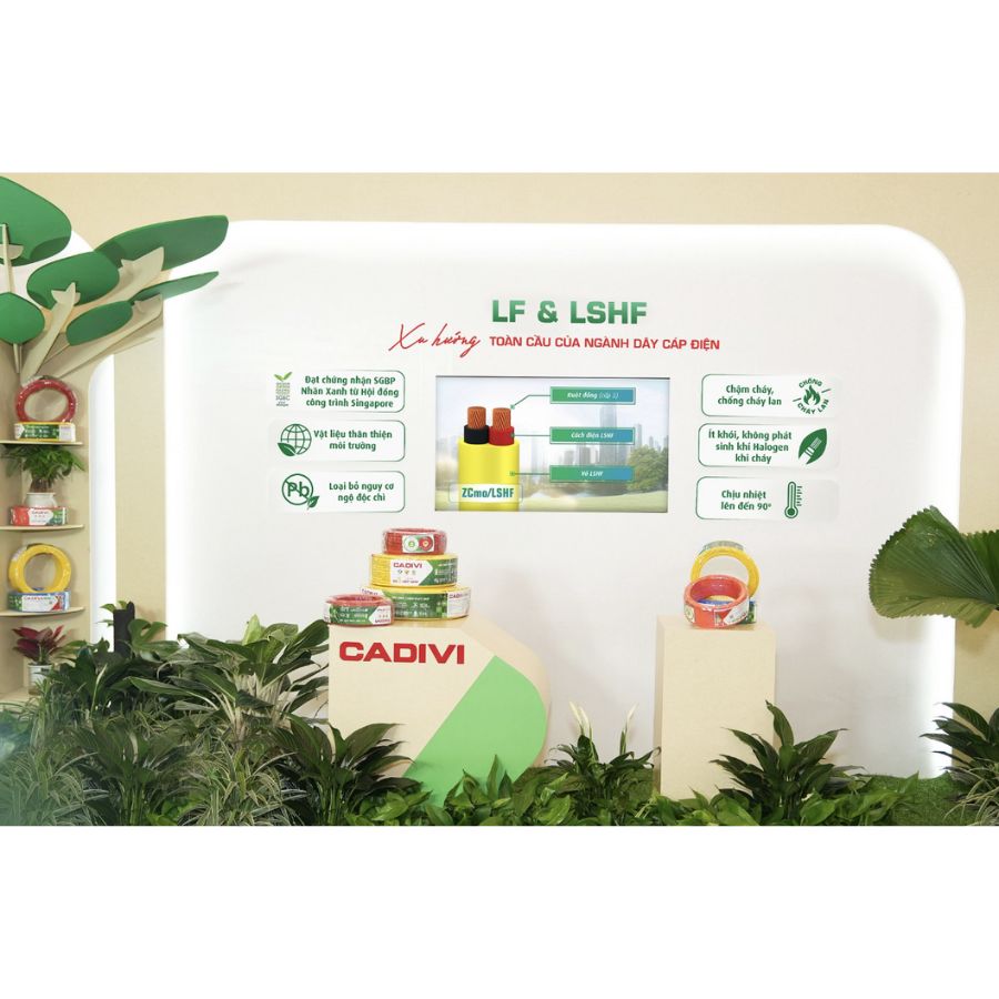 - Bên cạnh đó, CADIVI đã nghiên cứu và tiên phong phát triển các dòng sản phẩm xanh, an toàn, thân thiện môi trường: dây điện không chì (LF - Lead-Free) và dây cáp điện chậm cháy, ít khói, không halogen (LSHF - Low Smoke Halogen Free). Những sản phẩm này đạt chứng nhận SGBP (Singapore Green Building Product) do Hội đồng Công trình Xanh Singapore cấp, thể hiện cam kết theo đuổi mô hình tăng trưởng xanh, hài hoà giữa hiệu quả kinh tế và trách nhiệm xã hội.