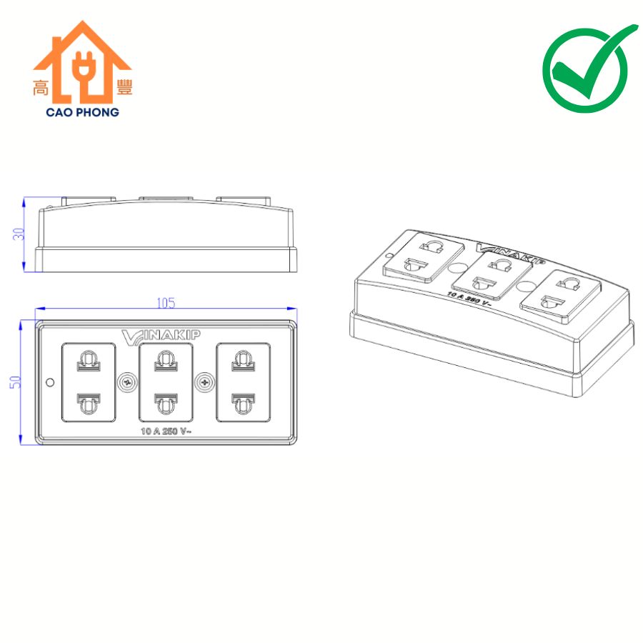 - Quy cách: Hộp gồm 10 cái ổ cắm 3 lỗ 2 chấu Vinakip.