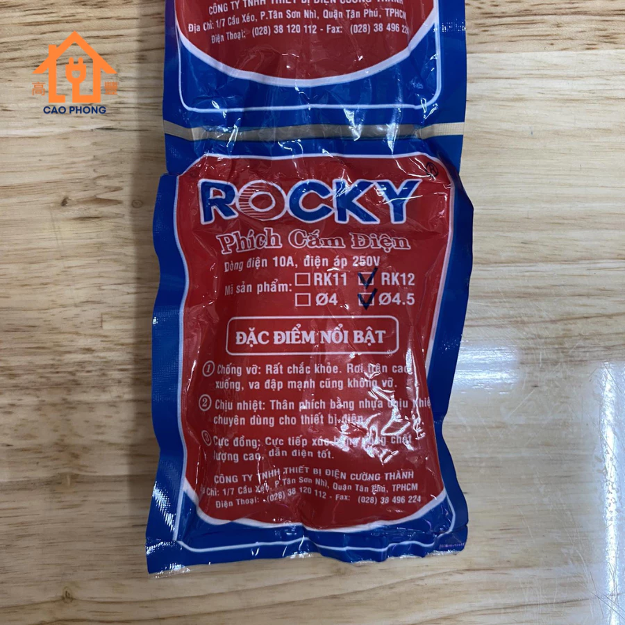 PHÍCH CẮM ĐỰC ROCKYXuất xứ: Việt Nam.Điện áp: 220V - 10A.Chất liệu: nhựa ABS.Chân cắm bằng: Đồng.Màu sắc: Trắng.